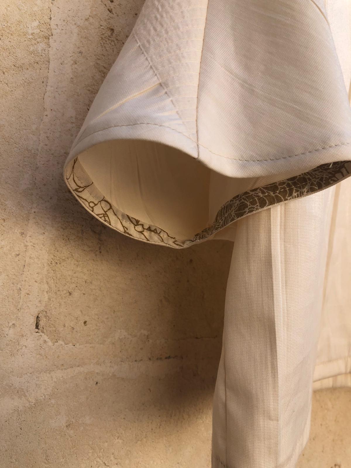 The inside of the collar and sleeves is finished with a floral fabric (the same as the skirt).